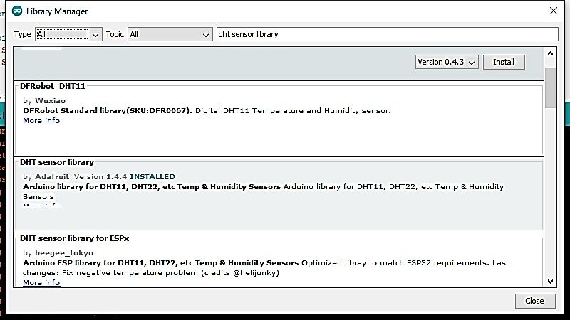 4. Look for “DFRobot DHT11” by DFRobot and click on the “Install” button to install the library.